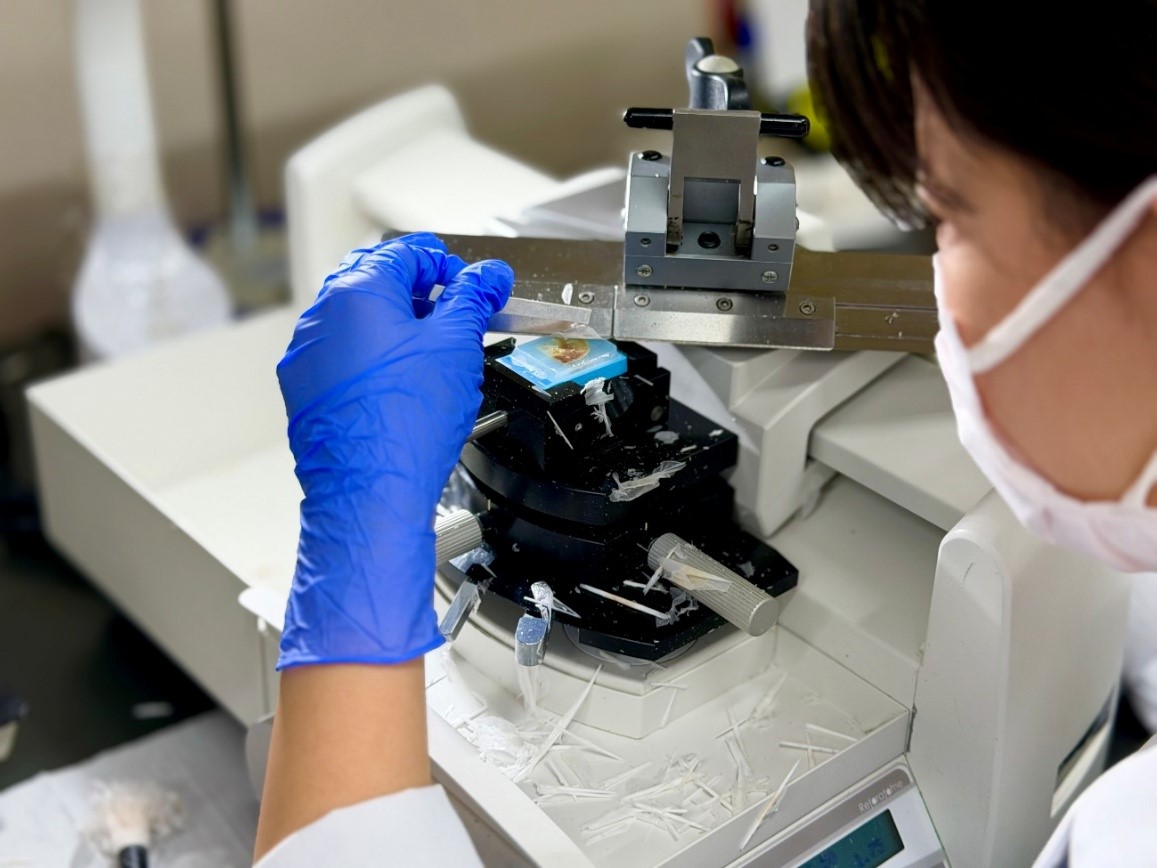 手術や生検で採取された組織を、固定・包埋・薄切・染色といった工程を経て、病理医が診断するために標本を作製します。
