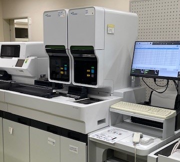 血球成分の数やヘモグロビン濃度、凝固因子などを自動分析装置で測定しています。分析装置で異常となったものは顕微鏡で目視し、貧血の有無や種類、炎症や血液疾患の診断に役立てています。