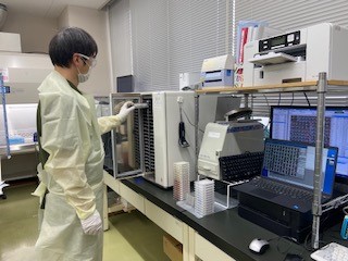 血液を遠心分離して得られる上清を用いて、肝機能、腎機能、脂質、電解質などの生化学項目をはじめ、肝炎ウイルス、梅毒などの感染症項目、腫瘍マーカー、甲状腺ホルモンなどの測定を行っています。検体搬送ラインを導入し業務の効率化を図り、迅速かつ正確な検査結果の提供に努めています。