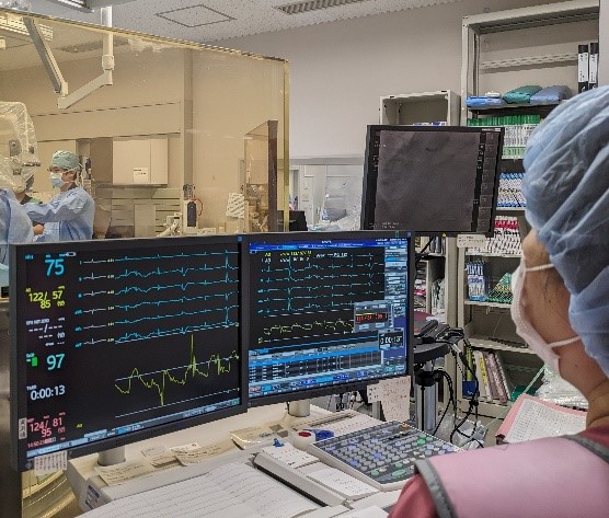 医師、看護師、診療放射線技師と共にカテーテル検査・治療に携わっています。主な業務内容は、心電図・血圧・酸素飽和度のモニタリングとデータ管理です。